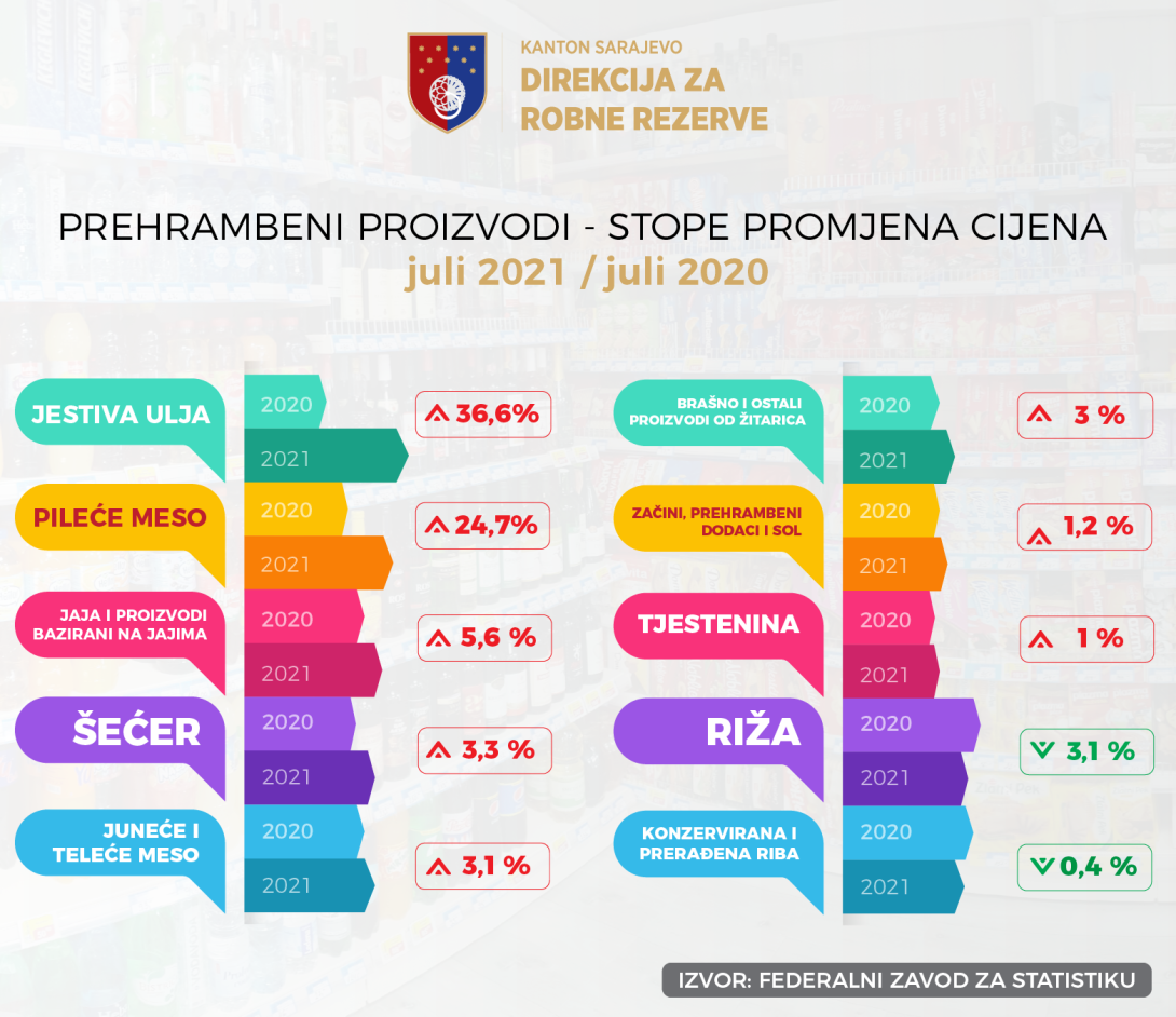 „Ukoliko poredimo cijene za juli 2021. godine u odnosu na isti mjesec prošle godine, na nivou Federacije BiH a prema podacima Federalnog zavoda za statistiku, u najvećoj stopi su porasle cijene jestivih ulja za 36,6% i pilećeg mesa za 24,7%. U analiziranom periodu, cijene jaja i proizvoda baziranih na jajima porasle su za 5,6%, šećera za 3,3%, juneće i teleće meso za 3,1%, brašna i ostalih proizvoda od žitarica za 3%, začini, prehrambeni dodaci i sol za 1,2%, tjestenine za 1%, dok su cijene riže, te konzervirane i prerađene ribe pale za 3,1 odnosno 0,4%“, napominje Pekić.