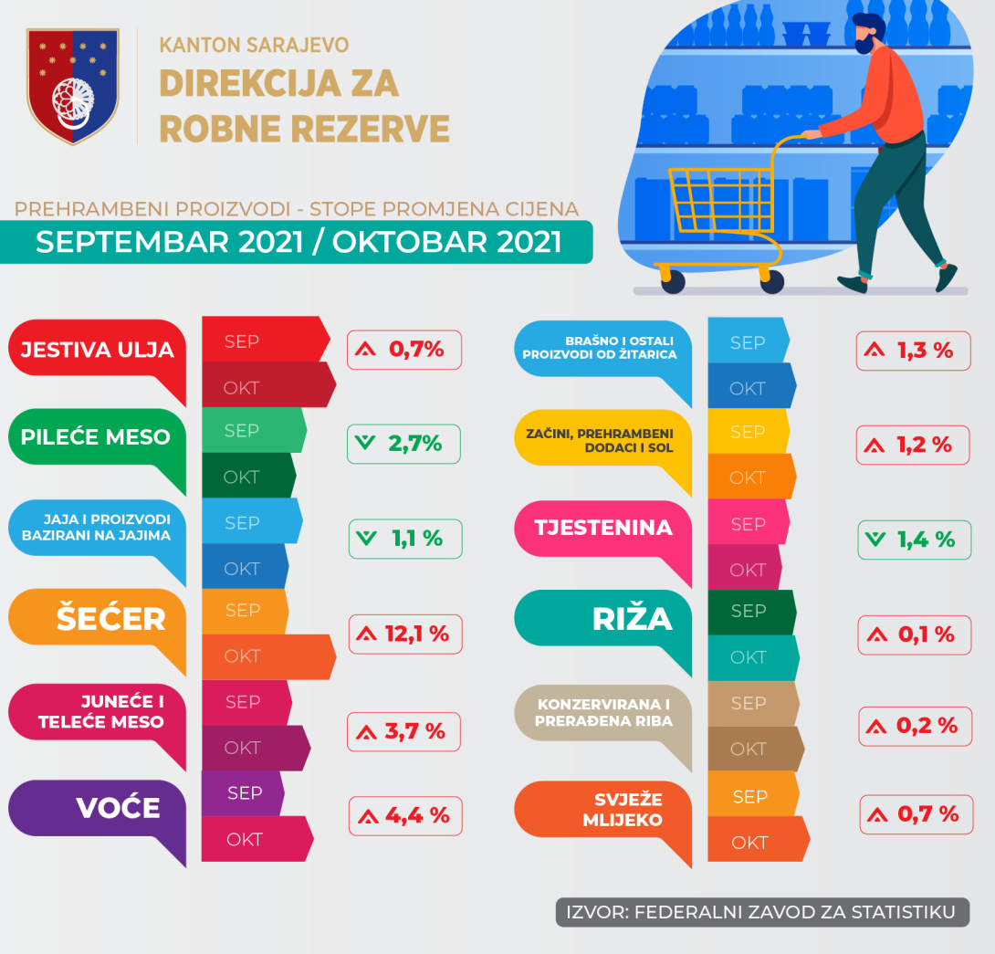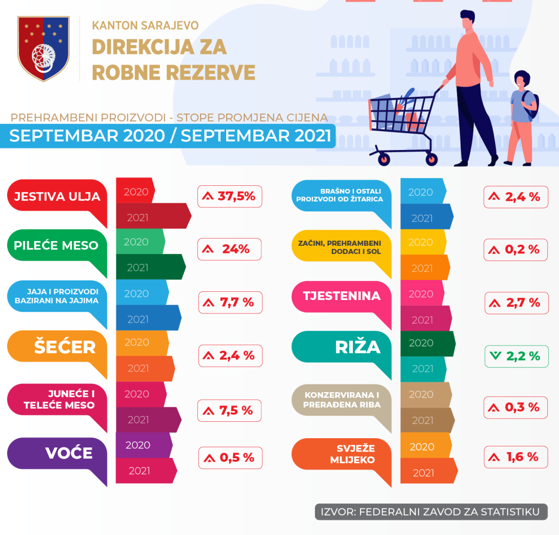 „Ukoliko poredimo cijene za septembar 2021. godine u odnosu na isti mjesec prošle godine, na nivou Federacije BiH, u najvećoj stopi su porasle cijene: jestivih ulja za 37,5%; pilećeg mesa za 24%; jaja i proizvoda baziranih na jajima za 7,7%; juneće i teleće meso za 7,5%; šećera za 2,4%; konzervirana i prerađena riba za 0,3%; brašna i ostalih proizvoda od žitarica za 2,4%; tjestenine za 2,7% i začina, prehrambenih dodataka i sol za 0,2%. Takođe, dodatno naglašavamo da su rasle i cijene povrća za 17,8%, svježeg mlijeka 1,6% i voća za 0,5% u septembru 2021. godine u odnosu na isti mjesec prošle godine. U istom analiziranom periodu snižena je cijena riže za 2,2%“, dodaje Pekić.