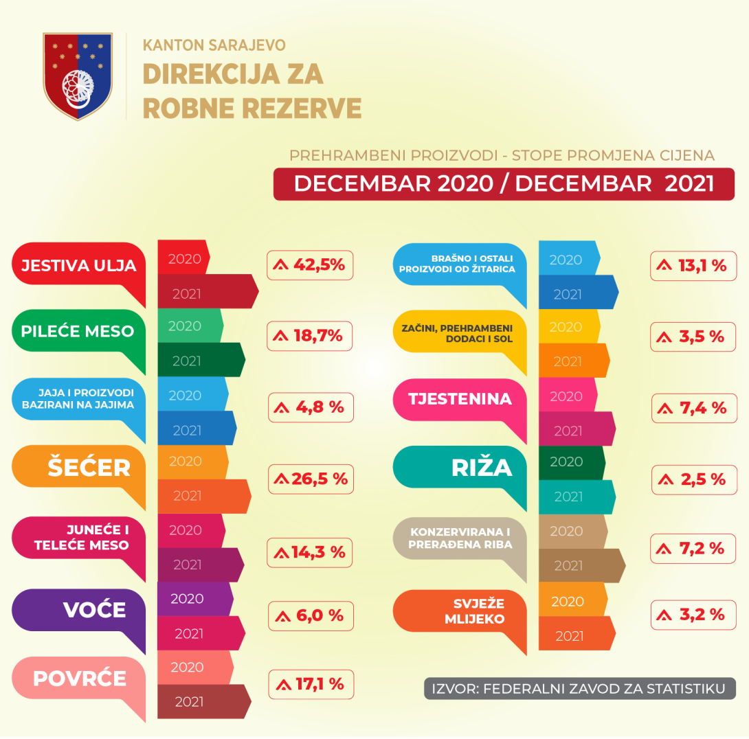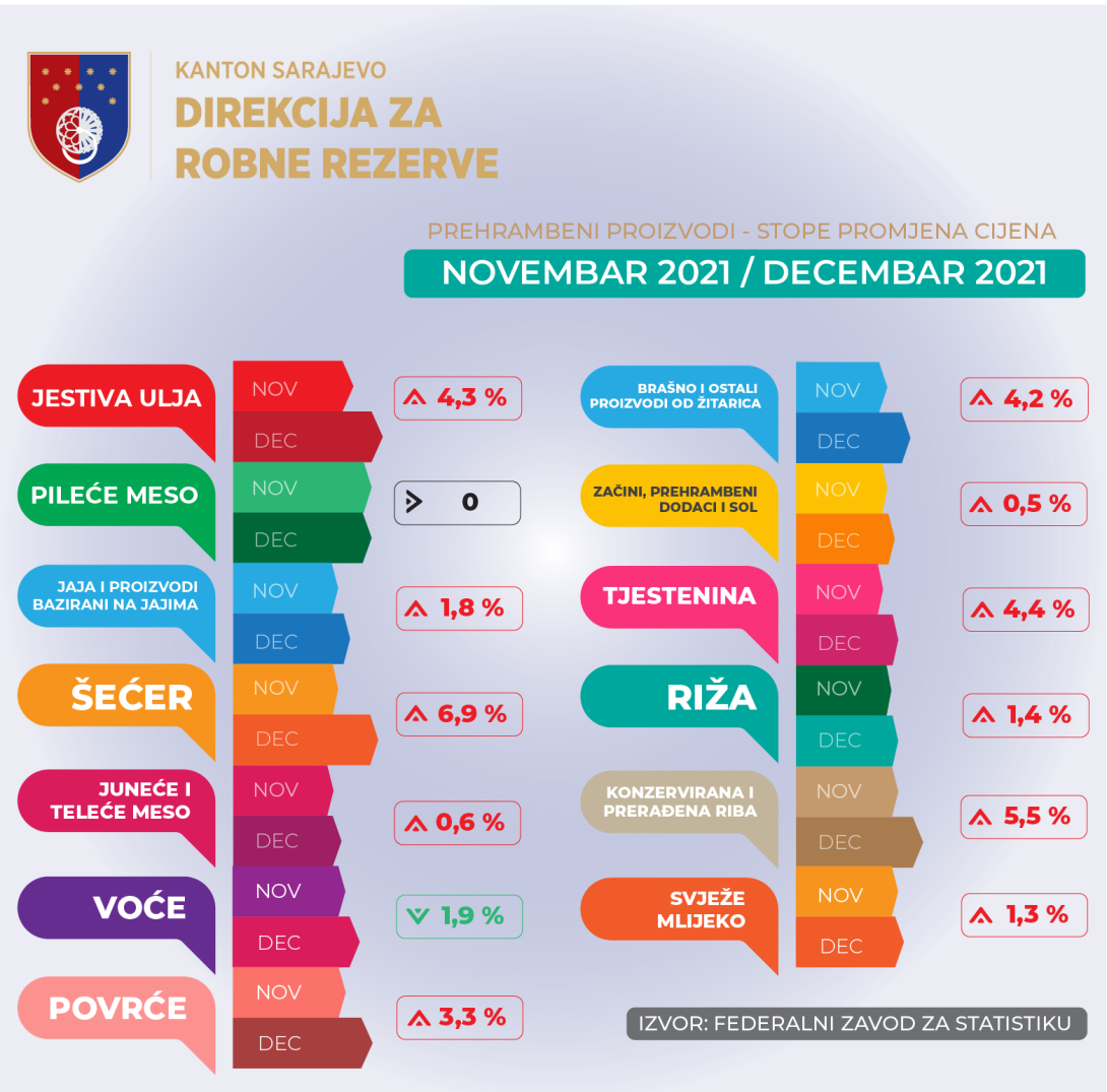 Uporedne analize cijena za novembar 2020. i novembar 2021. godine, kao i decembar 2020. i decembar 2021. godine i dalje pokazuju rast, koji direktno utječe i na upravljanje robnim rezervama, ali i direktno na kupovnu moć građana i građanki.