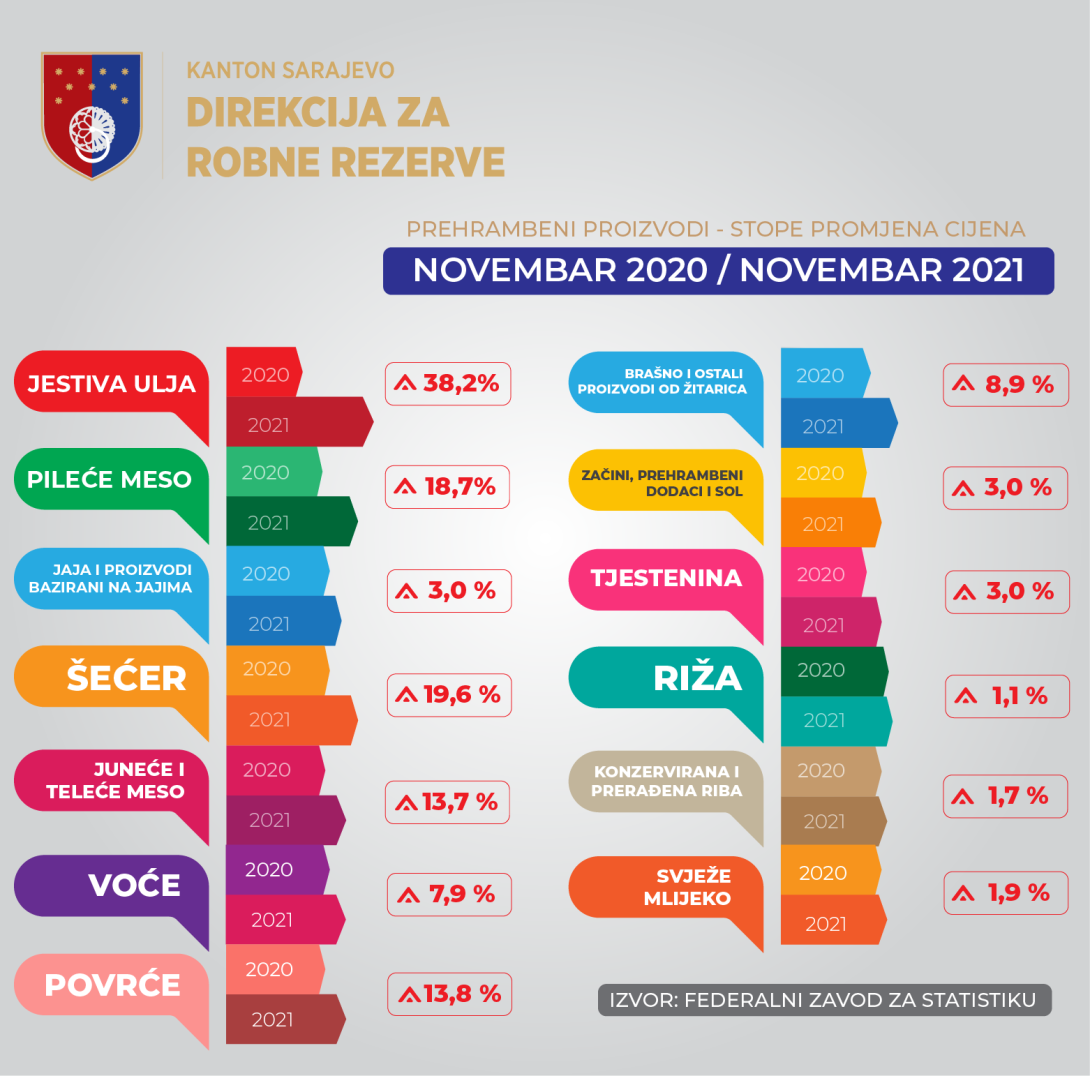 Ukoliko poredimo cijene za novembar 2021. godine u odnosu na isti mjesec prošle godine, na nivou Federacije BiH, u najvećoj stopi su porasle cijene: jestivih ulja za 38,20%; šećera za 19,60%; pilećeg mesa za 18,70%; juneće i teleće meso za 13,70%; brašna i ostalih proizvoda od žitarica za 8,90%; jaja i proizvoda baziranih na jajima za 3,00%; konzervirana i prerađena riba za 1,70%; tjestenine za 3,00% i začina, prehrambenih dodataka i sol za 3,00%. Takođe, dodatno naglašavamo da su rasle i cijene povrća za 13,80%, svježeg mlijeka 1,90% , voća za 7,90% i riže za 1,10% u novembru 2021. godine u odnosu na isti mjesec prošle godine.