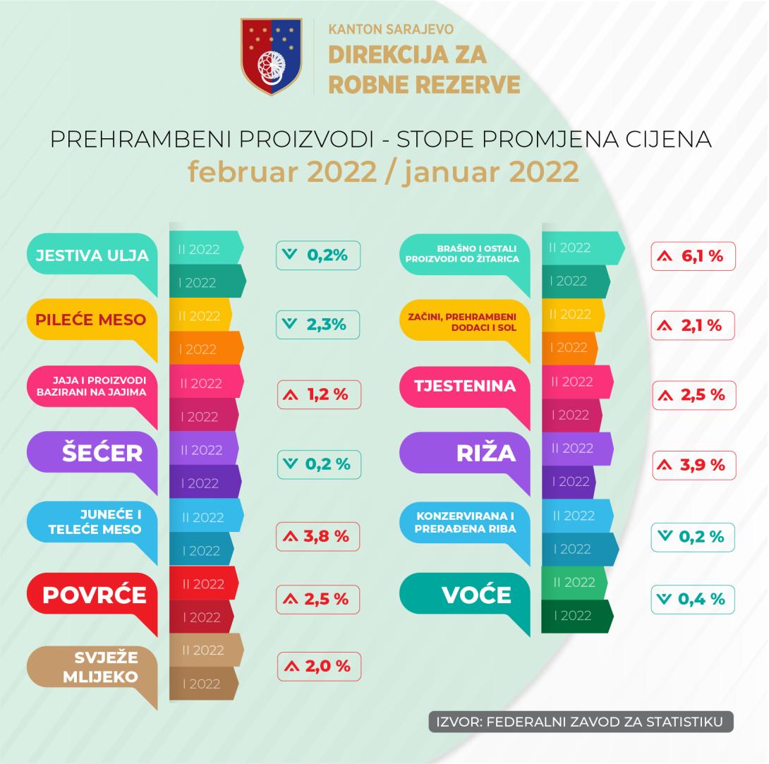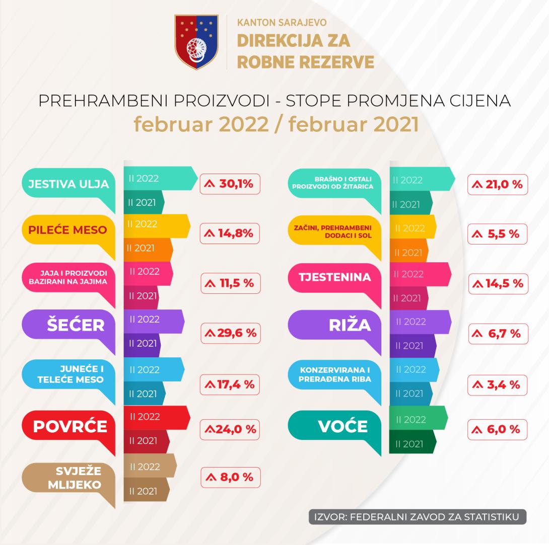 Ukoliko poredimo cijene za februar 2022. godine u odnosu na isti mjesec prošle godine, na nivou Federacije BiH, u najvećoj stopi su porasle cijene: jestivih ulja za 30,10%; šećera za 29,60%; pilećeg mesa za 14,80%; juneće i teleće meso za 17,40%; brašna i ostalih proizvoda od žitarica za 21,00%; jaja i proizvoda baziranih na jajima za 11,50%; konzervirana i prerađena riba za 3,40%; tjestenine za 14,50% i začina, prehrambenih dodataka i sol za 5,50%. Takođe, dodatno naglašavamo da su rasle i cijene povrća za 24,00%, svježeg mlijeka 8,00% , voća za 6,00% i riže za 6,70% u februaru 2022. godine u odnosu na isti mjesec prošle godine.
